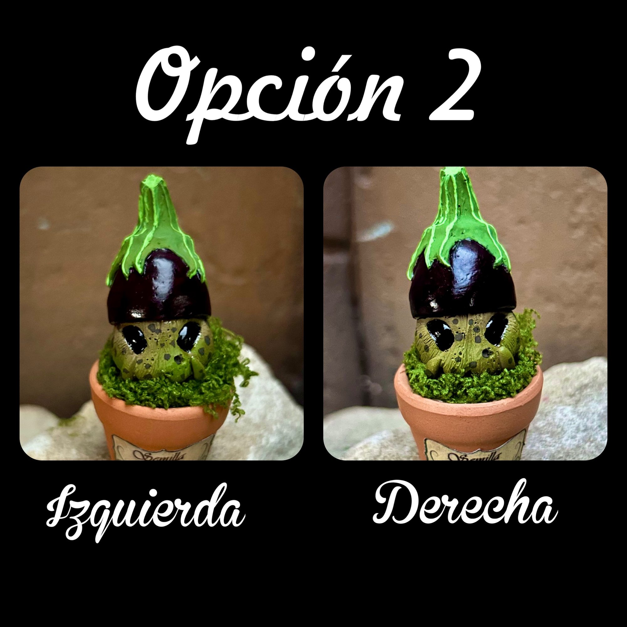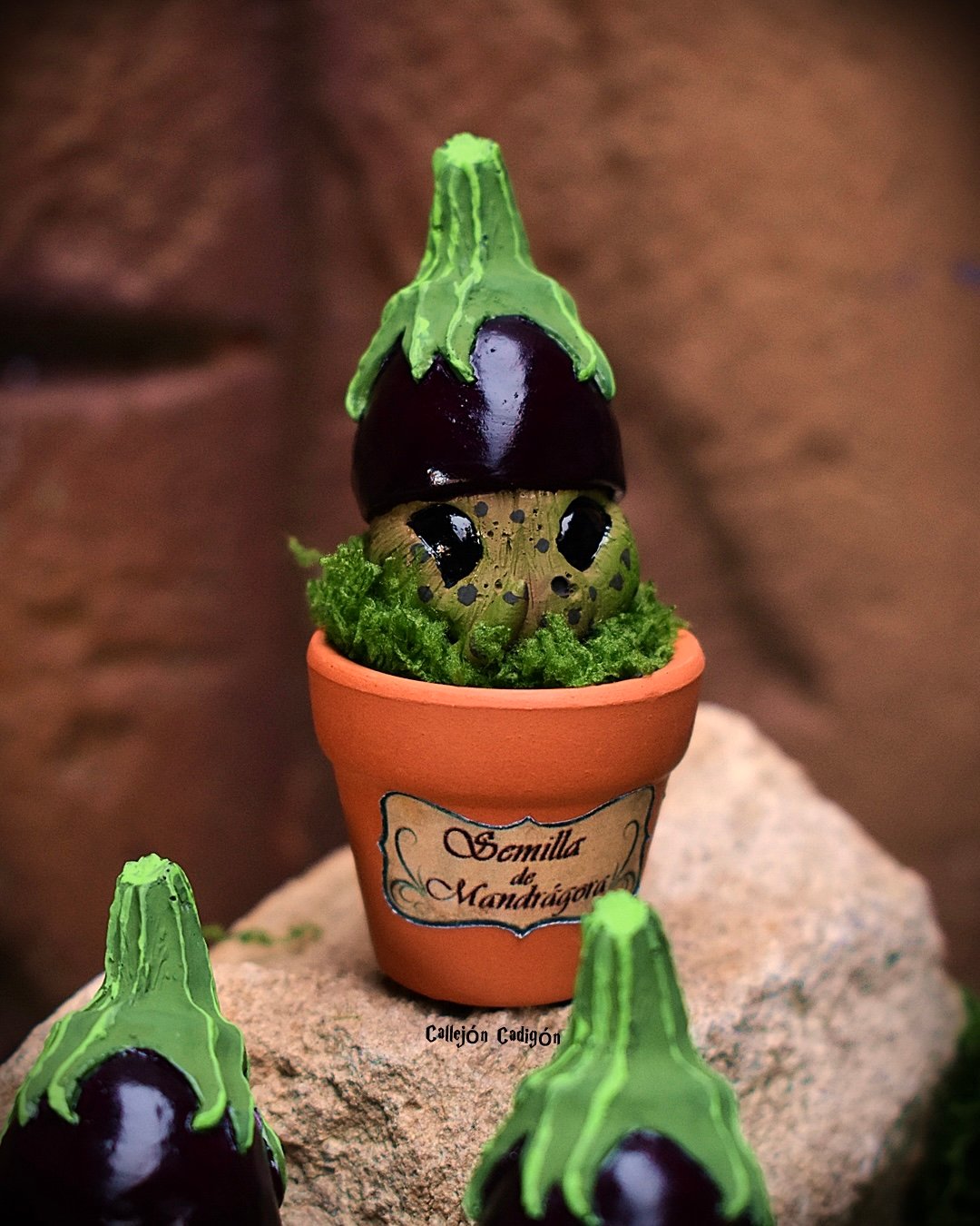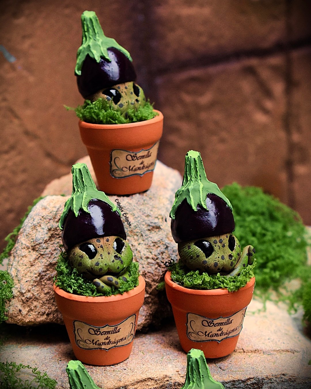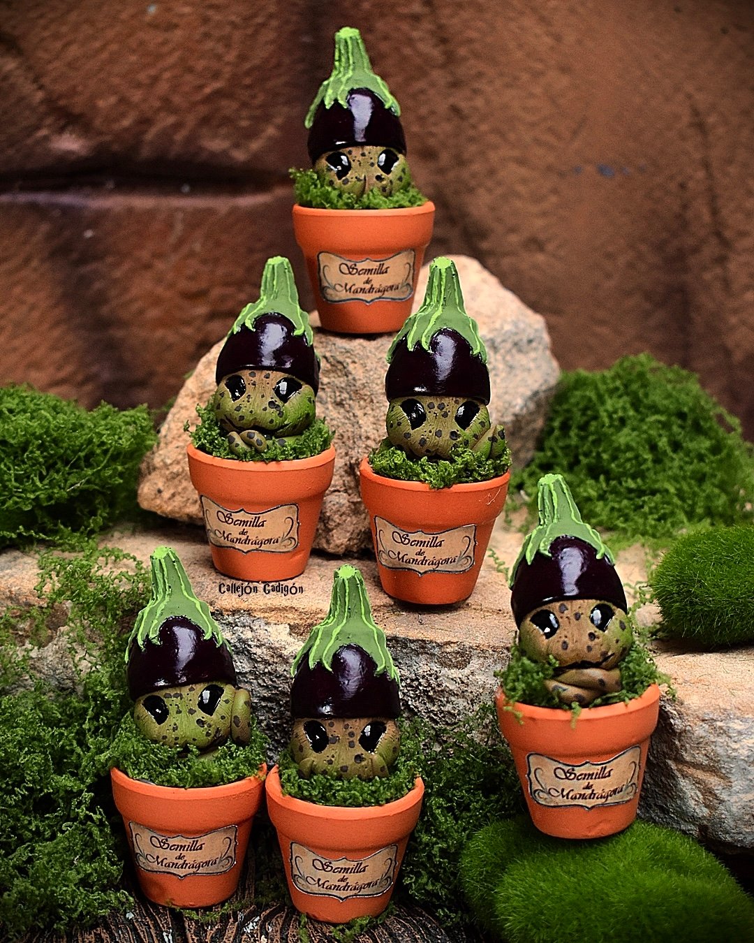 Desde la tierra húmeda y mágica, esta mandrágora con forma de berenjena brota lista para conquistar miradas.